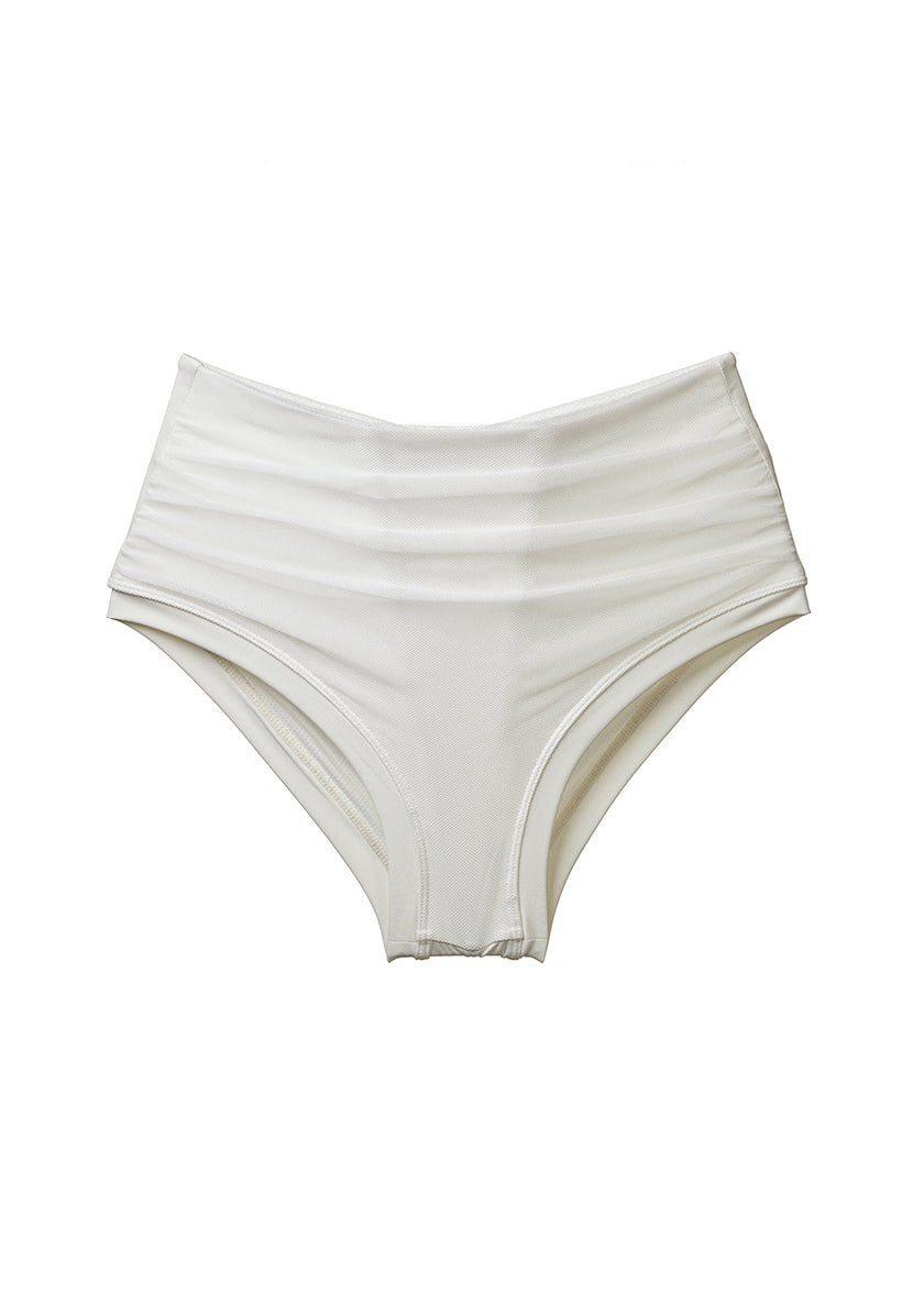 ・前面に横方向のドレープを施し、お腹まわりをやさしくカバーするデザイン