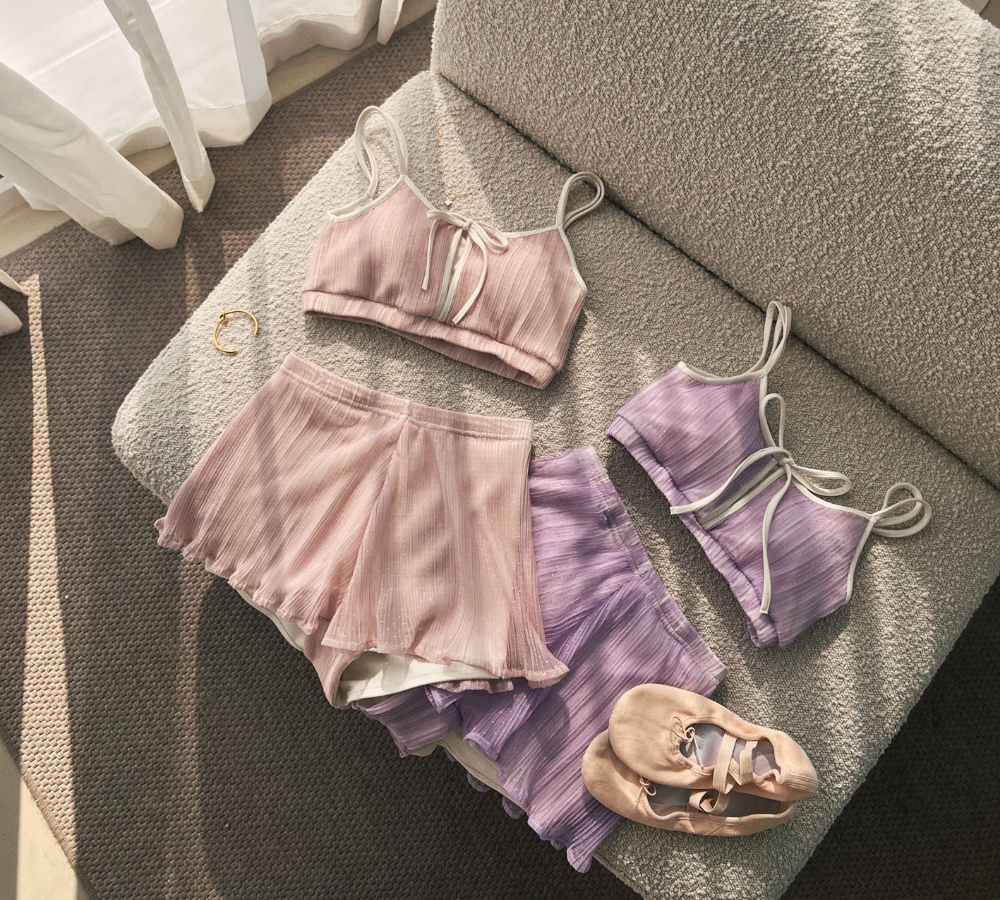 特に重要なのは、以前の「チェリーセット」で不足していたと感じられた部分が改善されていることです。内部のパンツはクリーム色ですが、下部には色のある生地を追加しています。このため、スプリット技を行う際もより快適で、動画でも美しく映ります。